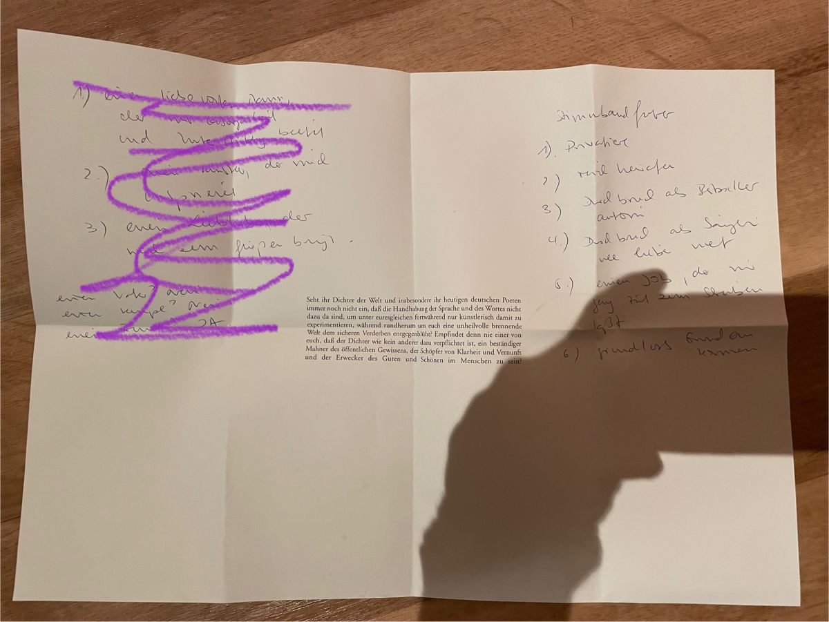 Es war einer dieser Tage, an denen ich morgens mit dem Gedanken aufstand, endlich einen Plan haben zu müssen. Um meine Existenz zu sichern. Ich ging also am späten Vormittag ins Literaturhaus und setzte mich in die Brasserie an einen Tisch mit den papiernen Platzsets mit Oskar Maria Graf-Zitaten drauf. Auf einem rief er zum Genuß auf, auf dem zweiten zur Revolution. Letzteres kam mir als Schmierpapier gerade recht.